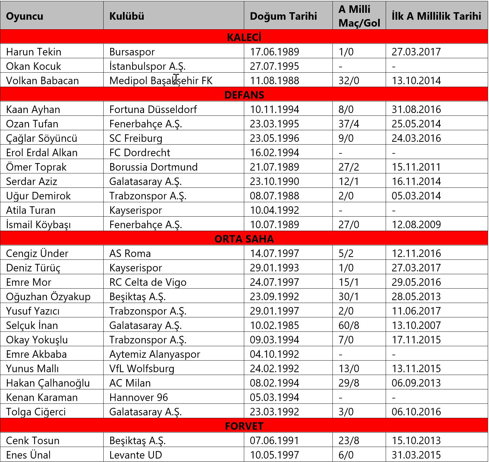 Новичками сборной стали: вратарь Окан Коджук из Истанбулспора, Эрол Эрдал Алкан из Дордрехта, Атилла Туран из Кайсериспора, Эмре Акбаба из Аланьяспора и Кенан Караман из Ганновера 96.